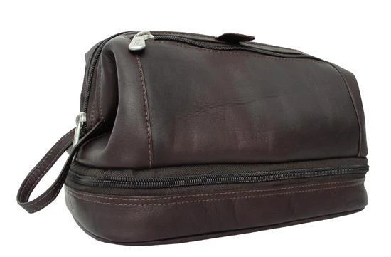 This kit features a structured U-frame top that opens wide and stays open for effortless access to your grooming essentials. The rich leather exterior is accented by a convenient side handle and a front zip pocket, while the interior is lined with water-resistant material to protect against spills. A unique false-bottom zippered compartment provides extra space for valuables or separate storage.