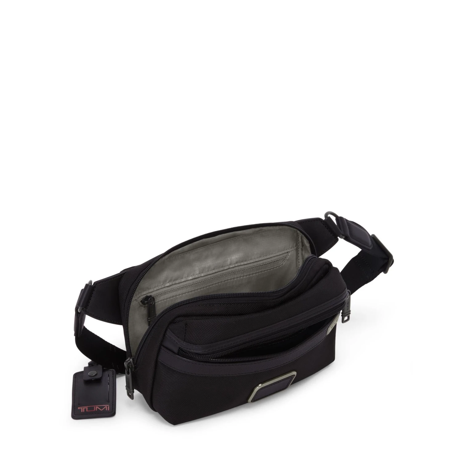 This sling showcases a rich, matte black texture characteristic of the Alpha collection, accented by a classic TUMI luggage tag and a dedicated monogram patch for personalization. Its triple-compartment layout is designed for the modern lifestyle, featuring a hidden magnetic phone pocket for seamless, one-handed access.